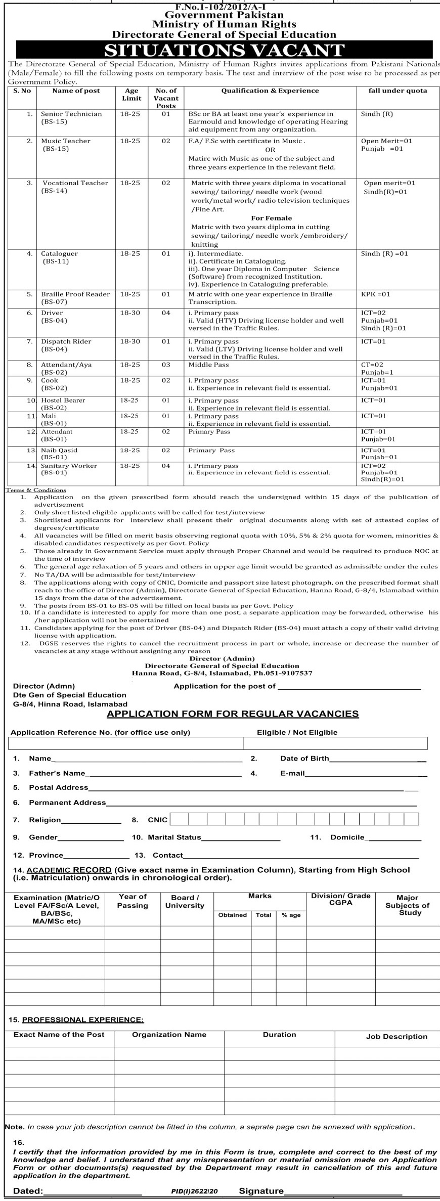 Ministry of Human Rights Directorate of Special Education Islamabad is inviting applications from qualified candidates for fulfilment of vacant positions as per criteria mentioned in the below advertisement.